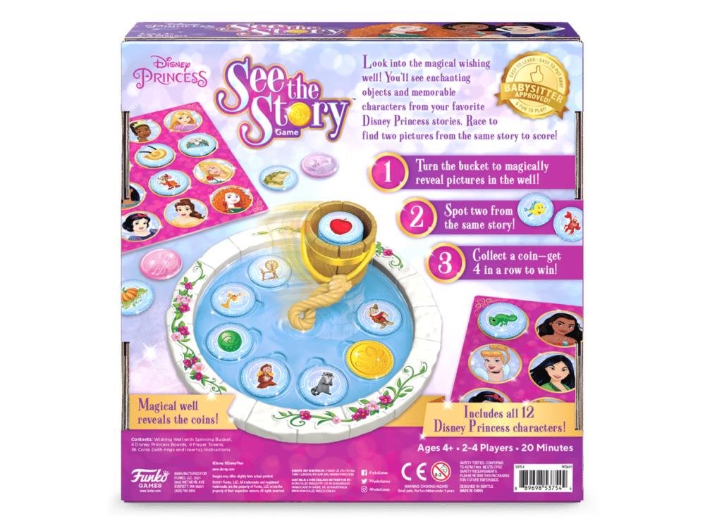 Look into the magical wishing well! You’ll see enchanting objects and memorable characters from your favorite Disney Princess stories. Race to find two pictures from the same story! Toss your token into the well and point out two pictures from the same Disney Princess story. If you’re right, collect one of the coins for your Disney Princess board! Be the first to collect 4 coins in a row to win!