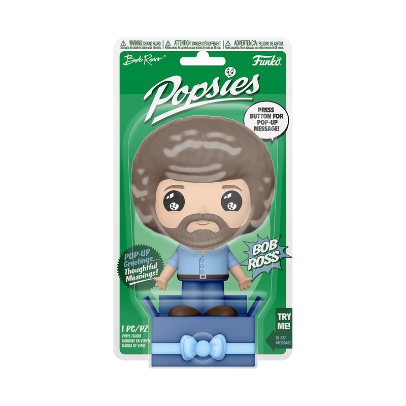 Surprise a friend or loved one with open arms and a pop up greeting with Popsies, the new collectible greeting by Funko! Press the center of the bow and the special message appears above Bob Ross as he holds his arms out wide. You can even write who it’s from and for with a permanent marker on the present’s label. Share a sentiment and a smile with an awesome Popsies Bob Ross! Vinyl collectible greeting is approximately 4.75-inches tall.