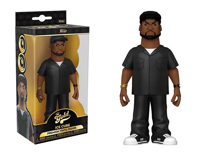 This 5-inch Premium Vinyl Gold figure features Ice Cube in a black hat, black shirt, black pants, and sneakers. This premium figure stands 5 inches tall and is part of the Funko Gold collection of figures.